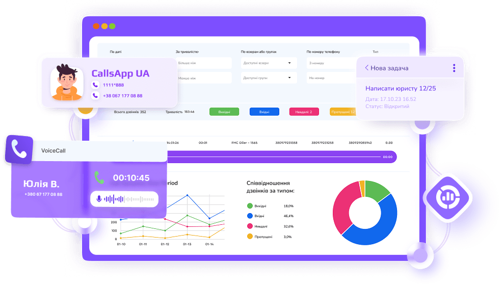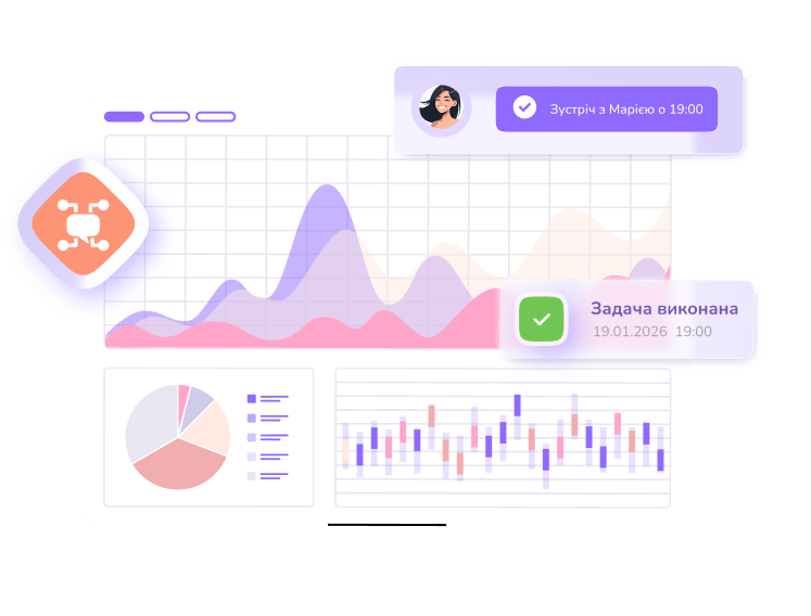 Забезпечує повний огляд активності в CRM: поточні статуси завдань, джерела лідів, статистику дзвінків та етапи воронки продажів.